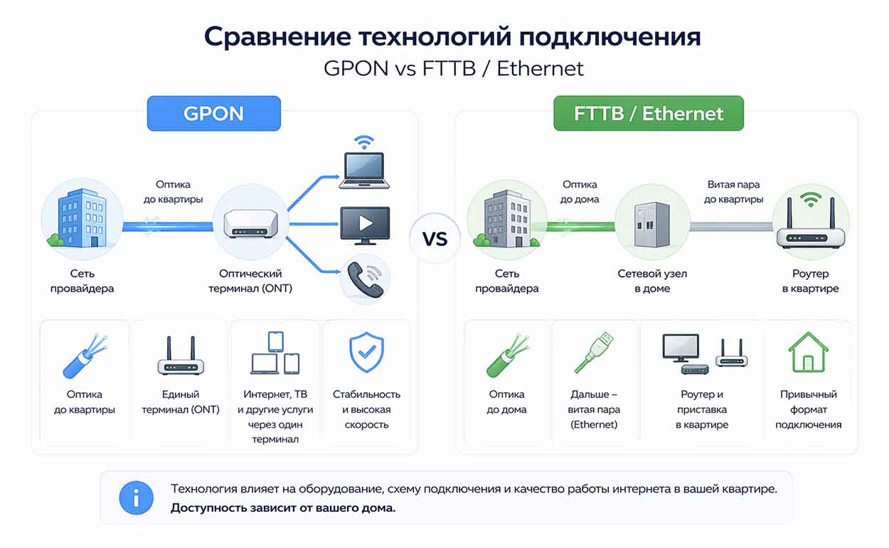 Технология подключения влияет на оборудование, домашнюю схему и реальный сценарий использования интернета в квартире